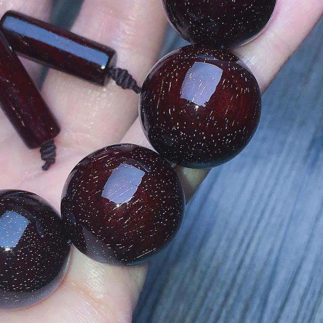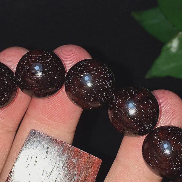 我们经常能从网上看到和一串珠子金光闪闪,上面全都是密密麻麻的金色的小斑点,这种的你别管多少钱不要去买它,这种的肯定不对,因为小叶紫檀的金星像这种密密麻麻的是人工做上去的,市场上冒充小叶紫檀的东西也很多,冒充小叶紫檀最像的木种比如非洲的血檀还有柯檀,原料区分相对容易一些,但是它们做成珠子再做个色再上个蜡能够以假乱真,尤其在网上卖你看照片根本是看不出来的,所以非常容易上当。