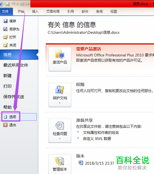 2. 法一:先点击左上角的“文件”-“选项”,如下图箭头所指。