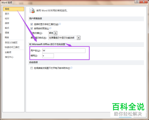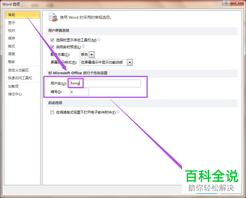 3. 然后在打开的界面右侧找到“对Microsoft ooffice进行个性化设置”选项,入戏下图箭头所指,在这个下方一栏是用户名,可以点击进行修改,改好之后点击确定即可。