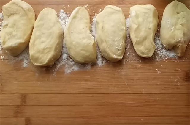 2.案板上撒上干面粉,把醒好的面直接搓成长条状,这一步我们不用揉面,我们把它切成大小相同的面剂,一斤面粉大约下10到12个面剂就可以,如果我们制作的太大的话,锅里是炸不下的。