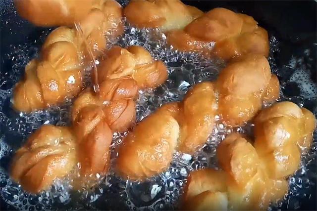 6.油温七成热的时候下入麻花,然后转成小火,我们炸制的时候不要用筷子翻动,因为它里面充满了气体,我们轻轻一碰它就会自动翻转,这样炸制出来的麻花就不会均匀,下麻花的时候要轻轻的放,防止溅油烫伤,炸至边缘微黄时即可翻面,两面都炸成金黄色的时候就可以出锅了。