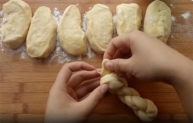 3.我们轻轻按压着把面剂搓成长条,然后像这样两手捏住面条的两端,分别向相反的方向揉搓上,我们把它对折过来,这时麻花已经自动上劲。