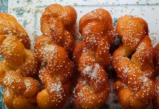 7.出锅之后我们稍微晾一会儿,然后均匀的刷上蜂蜜,如果麻花太热的话,会把蜂蜜的养分烫坏,刷好蜂蜜之后,撒上芝麻和椰蓉,然后翻过来里面也是刷蜂蜜,撒芝麻和椰蓉。