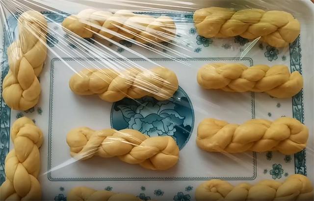 5.托盘刷油,放上麻花生坯,盖上保鲜膜醒20到30分钟,醒发至一倍大,拿起来的时候轻飘飘的就可以准备下锅了。