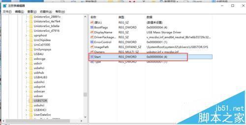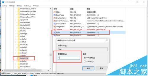 5、在双击USBSTOR找到右边的“start”双击。修改数值数据为:4, 基数选“十六进制(H)"默认设置为“3”表示手动,“2”是表示自动,“4”是表示停用。