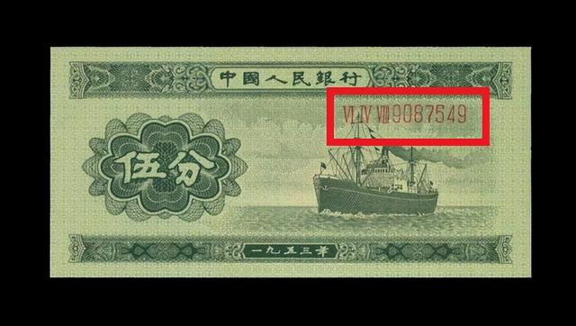 分别是带有阿拉伯数字的,就像红线圈出的部分,另外一种只有罗马冠字而没有阿拉伯数字,这种被称为短号码5分,短号码5分是1980年国内为了应对硬分币短缺,而采取的无奈之举,重新开始印刷5分、2分、1分这三种纸币,以替代铝分币的不足。