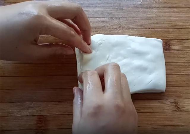 3.接下来我们把面皮先上下对折,然后在对折的地方抹上油,防止粘连,这样减少层次感,然后再次抹油,再左右对折。