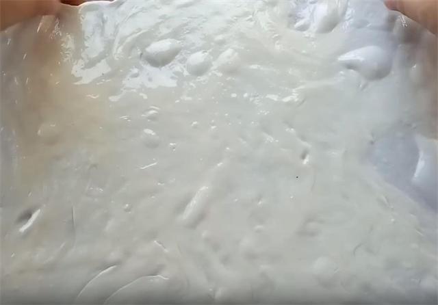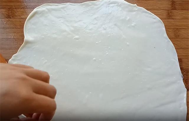 2.我们把醒好的面放在案板上,用手轻轻的按薄,按压至半透明状的时候,然后我们抹少许的油。