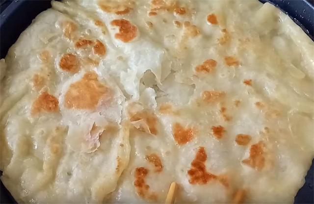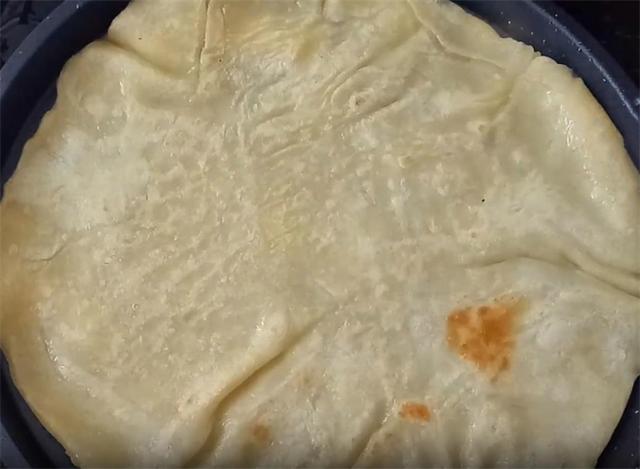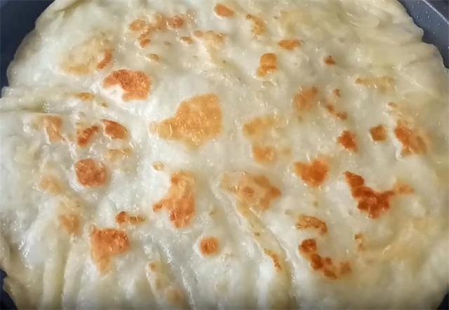6.刷好油之后我们翻面,把另一面也刷上油,然后盖上盖子焖一分钟左右,一分钟之后开盖,这时候饼已经鼓起来,然后我们再次翻面,然后再盖上盖子焖半分钟左右,另一面微黄即可出锅。