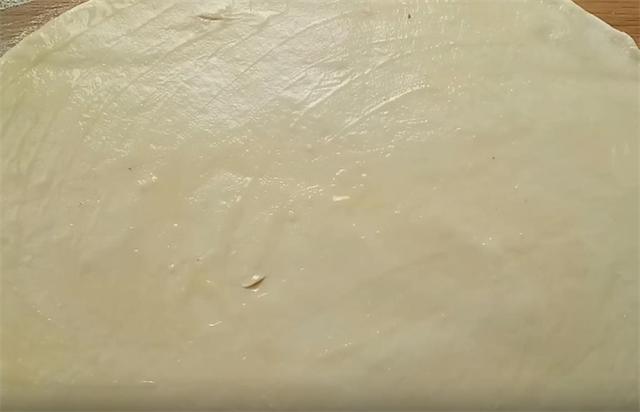 4.接下来我们把醒好的面直接放在案板上,不用揉面,直接把它搓成圆形的面团,然后用手掌把它按薄按均匀,撒上干面粉,接着用擀面杖把它擀薄擀均匀,擀制大约3毫米的厚度的时候,我们刷上油酥,大家记住油酥不要抹的太多,要不然我们后期擀制的时候,油酥会被挤出来,而且吃起来也会太腻。