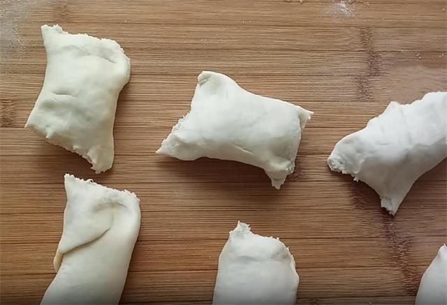 5.把油酥抹均匀之后,然后我们把面饼卷起,然后下成大小相同的面剂。