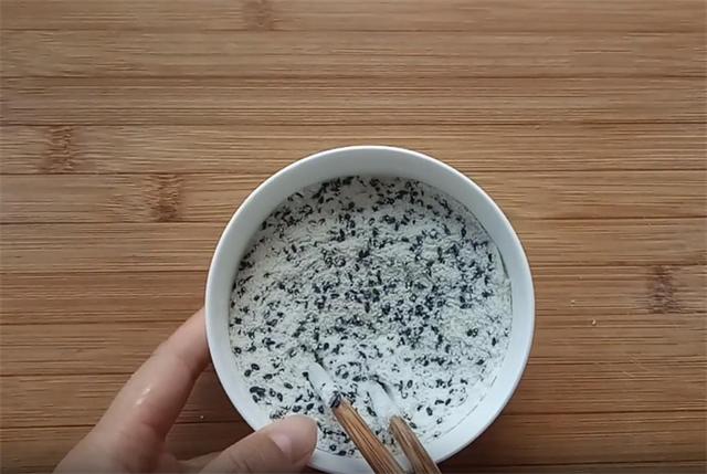 3.然后我们准备白糖馅料,面粉、白糖、黑芝麻按照1比1的比例加在一起,如果喜欢红糖的话,也可以放红糖,我们把它搅拌均匀备用即可。