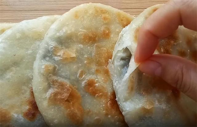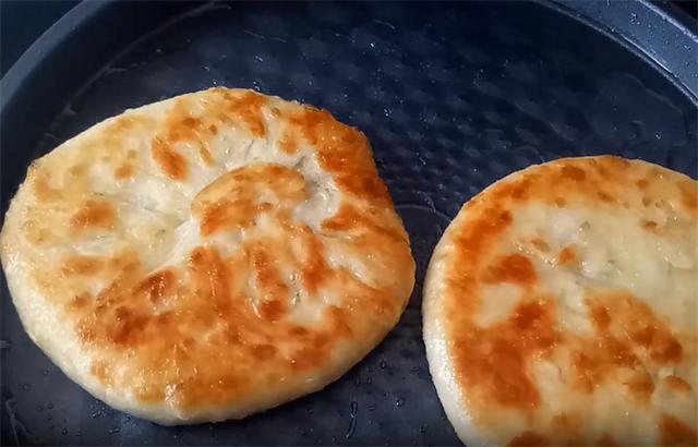 9.所有饼的生坯做好之后,我们起锅开小火,然后放入少量的油即可,油温六成热下入饼坯,我们用手轻轻的转动饼坯,使其均匀的沾上油脂,烙至饼皮微微鼓起,底面金黄,翻面烙至饼全部鼓起,另一面也呈金黄色时,再次翻面,再烙制30秒钟即可出锅。