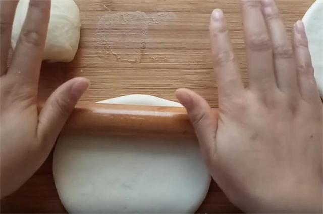8.把包好的生坯放在案板上用手轻轻按压几下,然后再用擀面杖正反面擀薄擀均匀,我们在擀制的时候不要用力,要轻轻的试探着擀,把厚的地方尽量擀薄,这样才不会把饼擀漏。
