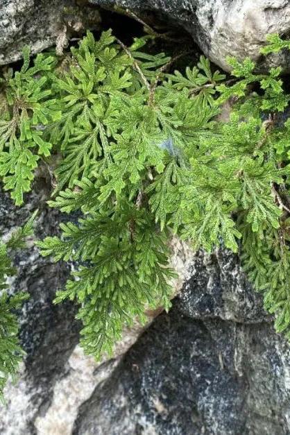这种植物叫做卷柏,花期在夏季,果期在秋季。它的叶片青翠茂盛,绿油油的一片,长在岩石上,山坡上或者石缝中,特别醒目,能够在这样恶劣环境中生存,着实证明它的生命力不一般。