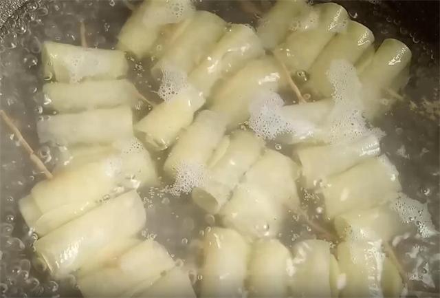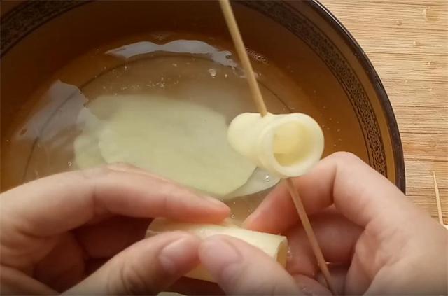 3.接下来我们把泡软化的土豆片像这样卷起,然后用竹签串起来。