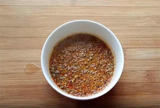 5.现在我们开始调制麻辣料,准备辣椒粉两勺,然后孜然一勺,加入麻辣鲜一勺,适量的胡椒粉、少许的麻椒粒、一勺芝麻、少许的盐搅拌均匀,然后把烧开的油浇在上面,油要分两次浇,防止一次加入辣椒变糊。