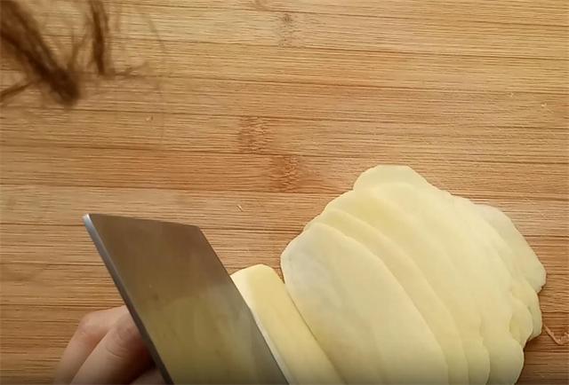 1.今天和大家分享一款麻辣土豆串,它的特点就是麻辣鲜香,口感爽脆,做法简单。我们准备一个土豆,洗净去皮,然后把土豆底部切下一片,扣在案板上,这样防止切的时候滚动切到手,我们把土豆尽量切成薄一点的片,也可以用削皮刀把它削成薄片。