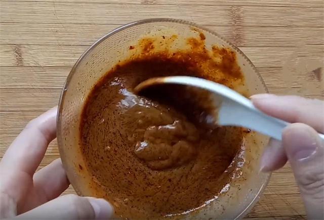 2.接下来我们来调制酱油油酥,两勺干面粉,一勺五香粉,适量的胡椒粉,一勺辣椒粉,油烧开分次加入,把辣椒和五香粉的香味炸出来,搅拌均匀之后倒入两大勺海鲜酱油,最好选用海鲜酱油,味道会比较鲜美,然后搅拌至微微粘稠状备用。