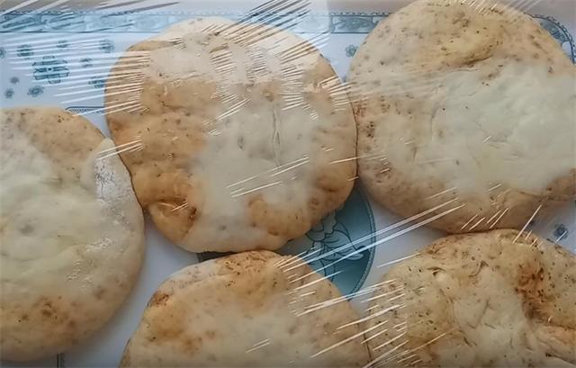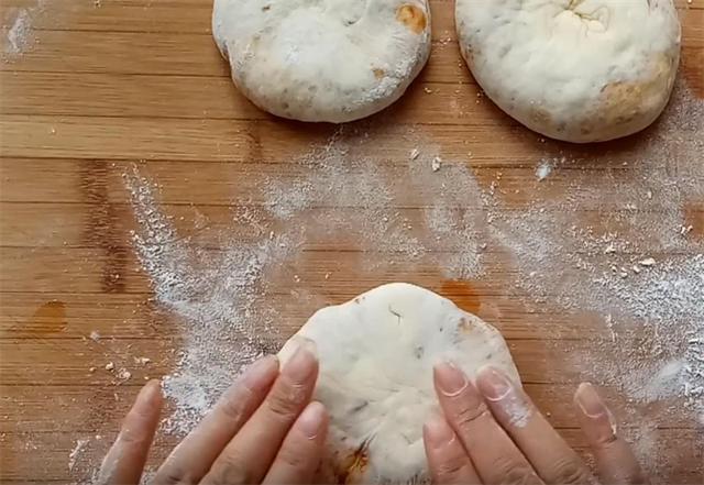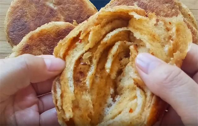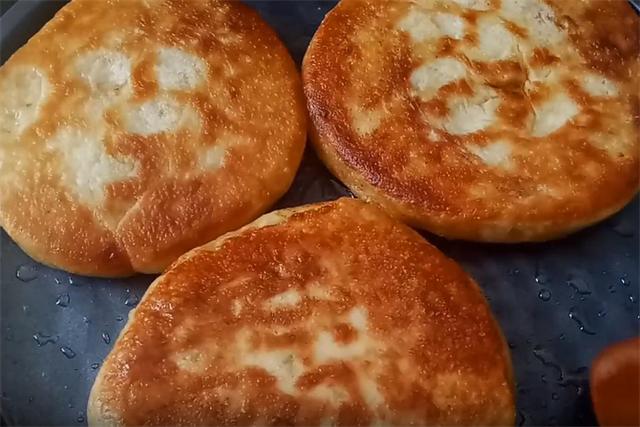 7.起锅开小火,油温五成热下入饼坯,烙至饼的底面微黄,表面微微鼓起的时候我们翻面,烙至另一面也呈金黄色时再次翻面,这时我们关火,用锅的余温,把饼的内部焖熟,焖制的时间不要过长,一分钟就可以。