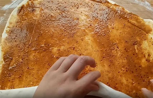 3.我们在案板上撒上干面粉,把醒好的面揉搓成圆形的面饼,用手按薄,撒上干面粉之后,用擀面杖把它擀薄擀均匀,把面饼擀至大约2毫米的厚度的时候,我们把酱油油酥撒上,用刮板把它刮均匀,油酥不要抹的太多,薄薄的一层就可以,如果多的话,我们卷的时候会把油酥挤出去。