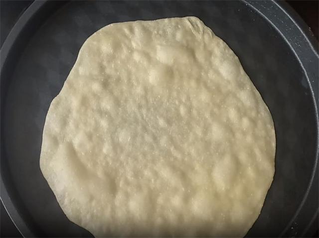 8.起锅开小火,把锅烧热,锅中不用刷油,然后下入饼坯大约10秒钟,饼的表面变色鼓起小泡,这时候不用翻面就可以出锅。