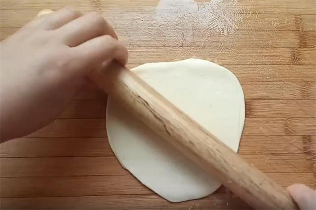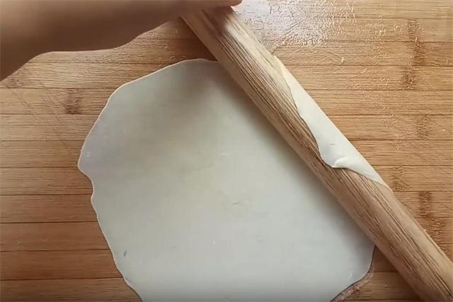 7.然后我们朝各个方向把饼擀薄擀均匀,用擀面杖把饼卷起,这样拿饼不变形不破损。