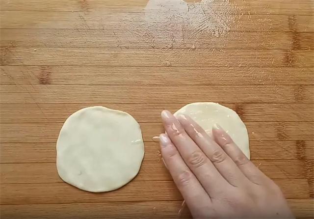 5.取两个醒发好的面剂,用手按扁,多抹一些油稣,这样烙好的时候容易揭开。