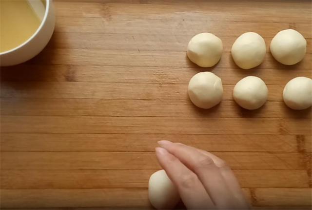 3.醒好的面不要揉,直接分成两份,搓成长条状,如果揉面的话,面的筋性就会增加,这样我们擀制的时候不容易擀开,下成十克左右的面剂,面剂要稍微小一些,因为我们后期制作的时候是两个面剂摞在一起,擀成一张饼,把面剂用手在案板上像这样滚圆。