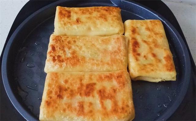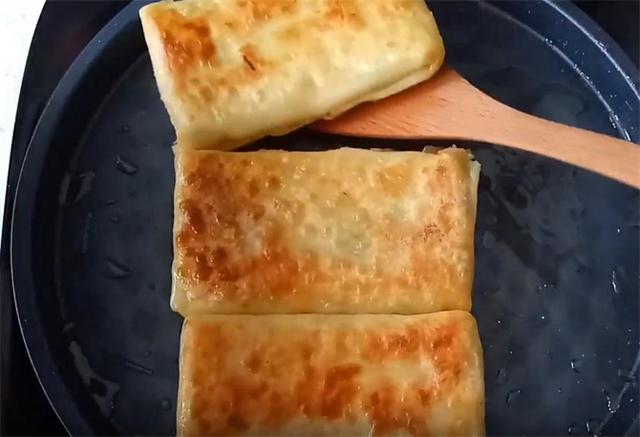 6.起锅开小火,放入少许的油,油温五成热,折叠面朝下下入饼坯,盖上盖子焖2到3分钟,两分钟之后开盖翻面,大约再烙制两分钟左右,烙至另一面金黄酥脆,再次翻面,直到烙至折叠面金黄酥脆即可出锅。