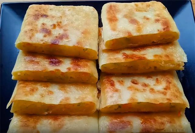 7.这样我们的土豆丝饼就做好了,切开一个给大家看一下,这个饼的饼皮一面是特别的柔软,另一面是酥脆的口感,馅料是特别软糯的,喜欢就赶紧试试吧。 |
