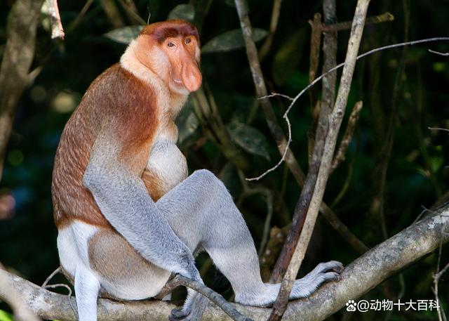 白脸僧面猴是僧面猴属中体型最小的一种猴类,它们的长相相当特别。它们的脸庞圆而略微扁平,覆盖着短而密集的茸毛,有点像一个老和尚的脸。白脸僧面猴还展示出性别差异,雄性更大一些,而且雌雄之间的毛色有明显的区别。雄性整个身体都是黑色的,只有脸部是白色的;雌性的皮毛较短,呈现出斑驳的棕色,从眼睛到鼻子还有两条苍白色的垂直线,此外有时候胸部周围可能充满橙棕色的皮毛,并一直延伸到腹部。 4、长鼻猴