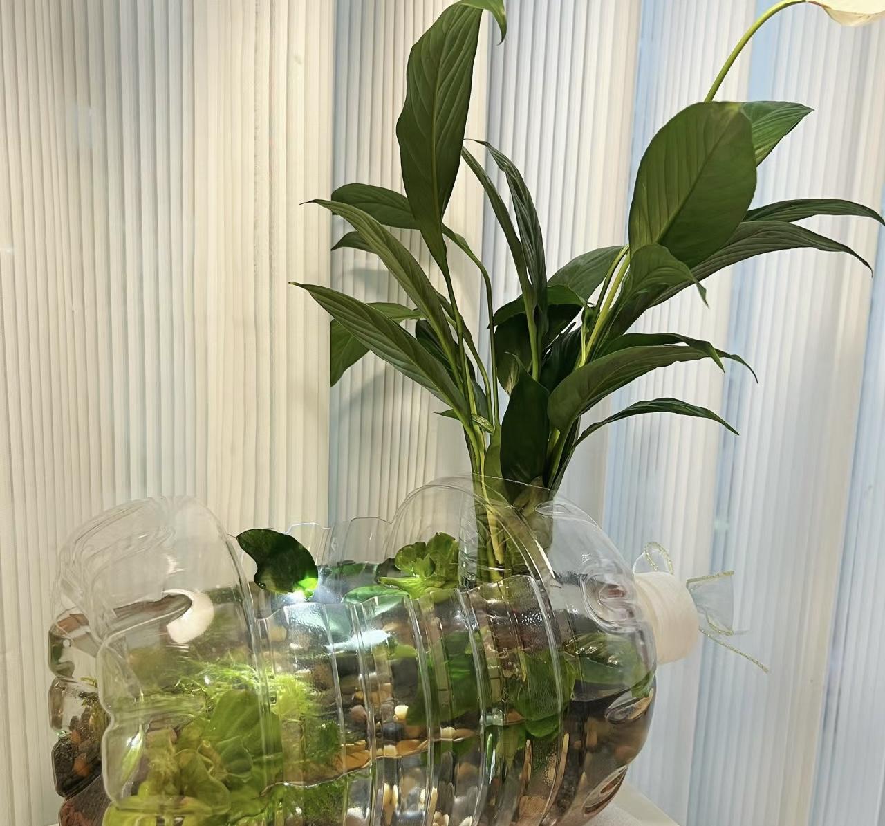 若想制作生态鱼缸,需要使用大升矿泉水瓶或者油桶,最好用前者。把塑料桶平放,随便在一面,剪成如图所示模样。再找来一个小的矿泉水瓶,在弧度的位置剪一刀,保留有弧度的位置,插入圆孔中,这样一个简易的生态鱼缸就制作而成了。 你可以在底部放上火山石和水藻泥,彩色石子,然后配一些自己喜欢的水草,放上几条小鱼,小的矿泉水瓶里,水培花卉,例如铜钱草,白掌,红掌等。这样一个动静结合的生态系统就制作而成。