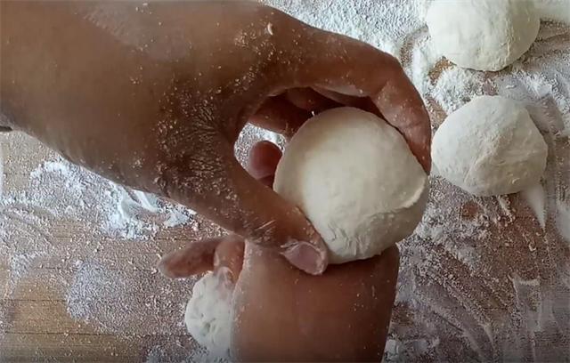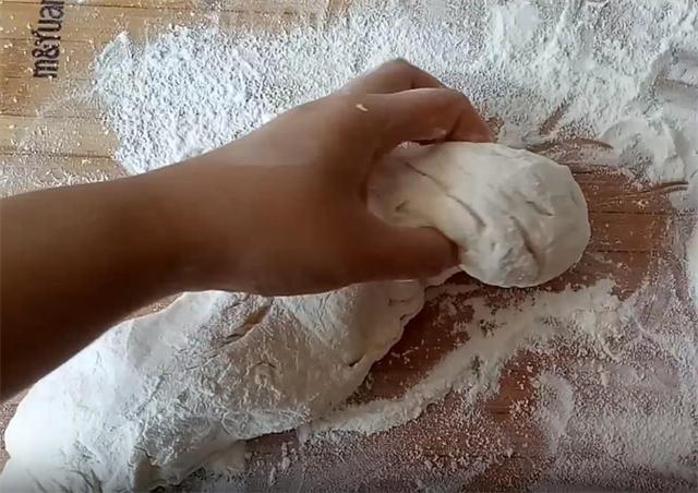 4.这时我们手上沾上一些干面粉,把面糊向里翻转做成圆形,增加它的筋性和硬度,这样面团才能成型,然后用虎口把它掐断,做成面剂,这样方便我们操作,用这个方法,即使面和的再软也可以操作。