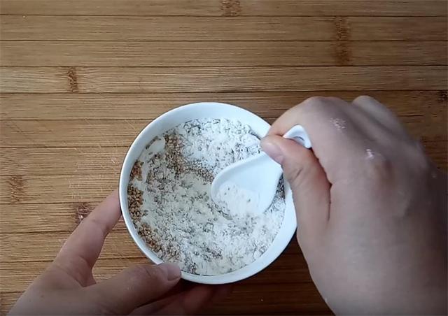 2.接下来我们来调下白糖馅,熟芝麻20克,加入30克白糖,十克干面粉搅拌均匀备用,加干面粉是使糖馅粘稠不流淌。