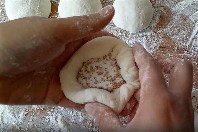 5.接下来我们把做好的面剂,像这样用手把它捏薄,捏均匀,包入糖馅,手上沾一些干面粉,把它的封口像包包子一样捏合,因为这个面特别的软,所以说很容易操作,很容易捏合。