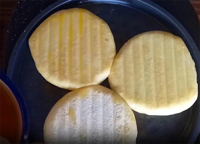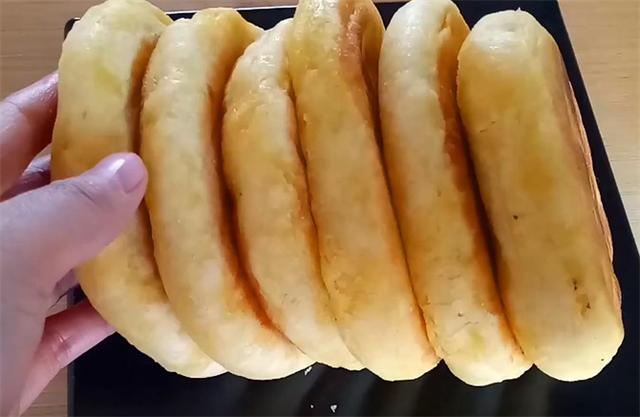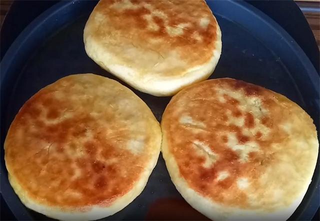 8.时间到开盖,在饼皮上刷一层凉油,刷凉油使饼皮更加的柔软,这时我们翻面,翻过来之后再烙制约一分钟,烙至饼的中间鼓起,两面都成金黄色,用手按压立即回弹,表明饼的内部已经熟透,这时就可以出锅了。