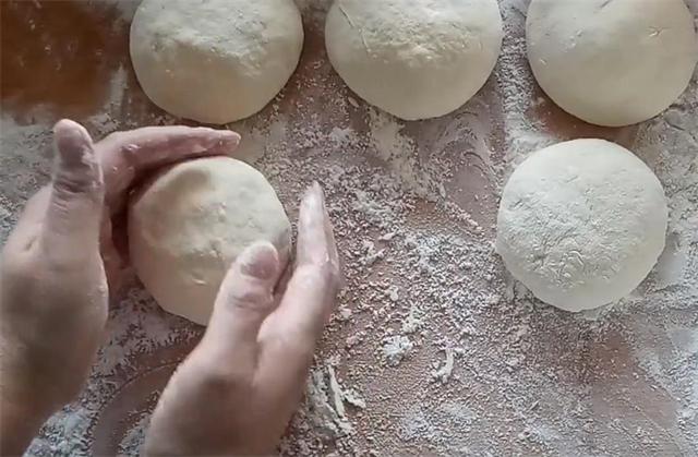 4.我们在案板上多放一些干面粉,把发好的面糊倒在面粉上,防止粘连,利用面粉把面糊整理成长条形,这时我们手上沾一些干面粉,把面糊向里面翻转,相当于揉面,增加它的筋性,使它更容易成型,然后把它翻转成圆形,用虎口掐断,揪成面剂。