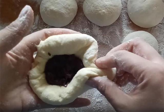 5.把面剂用手按薄,包入豆沙馅,用包包子的方法收口,因为这个面特别软,所以说很容易收口。