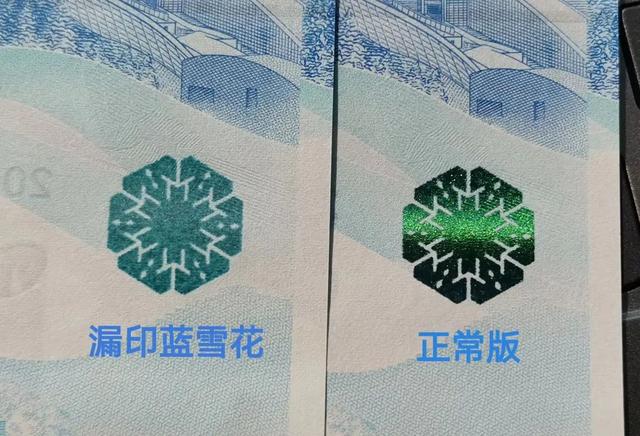 它的最大特征,就是纸币的安全线存在竹节般断续。 目前,竹节钞尚未有定论出现。如今它单张就要好几千,号码不错的甚至要好几万,我们在等待新币发行之余,也可以去找找看。 更多争议版别而在此之前的纪念钞中,其实也存在不少争议版别,被认为是人为造假。 其中已被明确为假的,是冬奥钞中发现的蓝雪花。