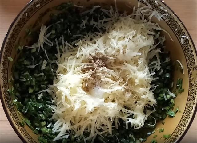 3.接着我们把土豆擦细丝备用,一定要擦细丝,如果是切的话,有棱角容易把饼皮戳破,加入适量的盐、花椒粉搅拌均匀备用,不需要加太多的佐料。