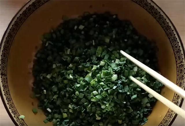 2.接下来我们来准备馅料,韭菜一斤,中等的土豆两个,把韭菜洗净控干水分,切碎备用,切好的韭菜中先倒入食用油搅拌均匀,油能够隔绝韭菜与盐接触,防止出水。