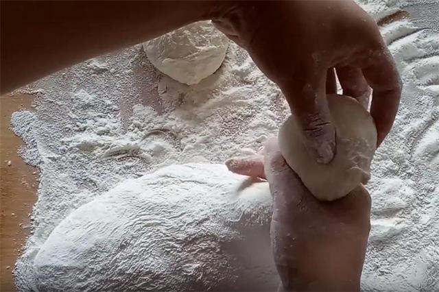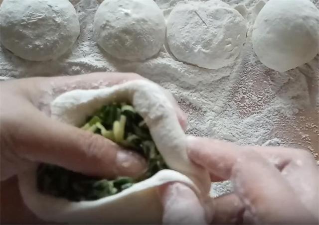 6.接下来我们把包好的饼坯上面多余的面捏扁覆盖,使两面饼皮薄厚均匀,这样不容易破损,由于这个面特别软,所以说我们要包好一个饼坯下锅一个,防止馅料出水,饼皮破损。