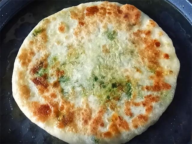 8.开盖后翻面刷少许油,再烙制约一分钟左右,烙至饼鼓起,说明内部熟透即可出锅,因为这个饼特别的薄,所以说两分钟足够烙熟。