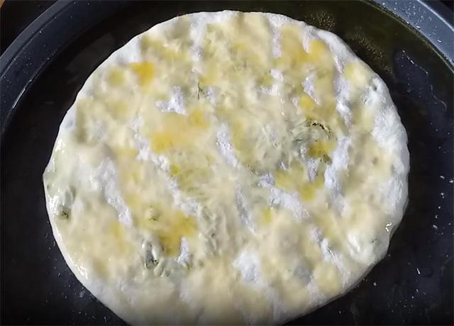 7.起锅开小火,油温五成热,下入饼坯,轻轻地试探着把饼按薄按均匀,接下来在饼上刷一层凉油,这样能够锁住饼内部的水分,使饼皮柔软,盖上盖子焖一分钟。