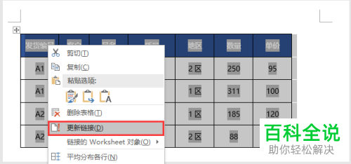 2. 接着,打开Word,同时按住“Ctrl” “V”组合键将刚刚复制的表格粘贴到Word中,然后在右下角找到并点击“粘贴”,在弹出的菜单中点击“链接与保留源格式”,这样之后,Excel中表格数据发生改变后,Word中表格的数据也会随之改变。 3. 如果我们发现数据没有同步改变该怎么呢?选中Word中的整张表格,并右键,在弹出选项中点击“更新链接”即可。