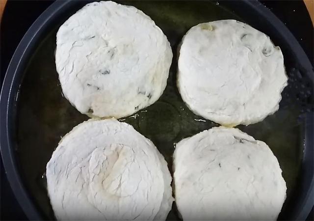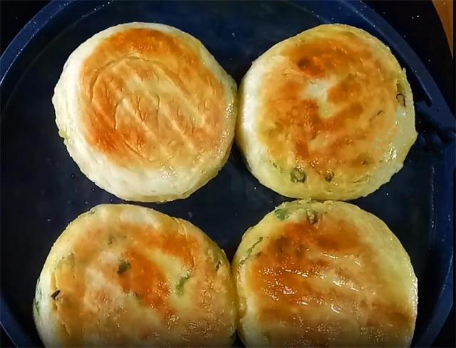 7.做好的饼坯醒发十分钟之后按扁,起锅开小火,油温五成热下入饼坯,用手轻轻的把它按均匀,这样薄厚均匀,饼的成熟度才能一致,盖上盖子焖两分钟,这样做是使其内部能够熟透。
