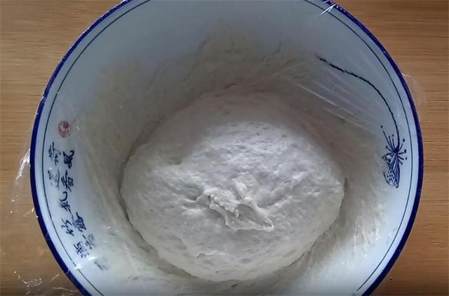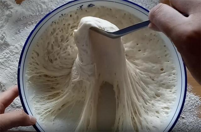 3.面糊必须醒发到这种程度,做出的发面饼才会柔软蓬松,我们在案板上多放一些干面粉,把醒发好的面糊倒在面粉上,防止粘连。