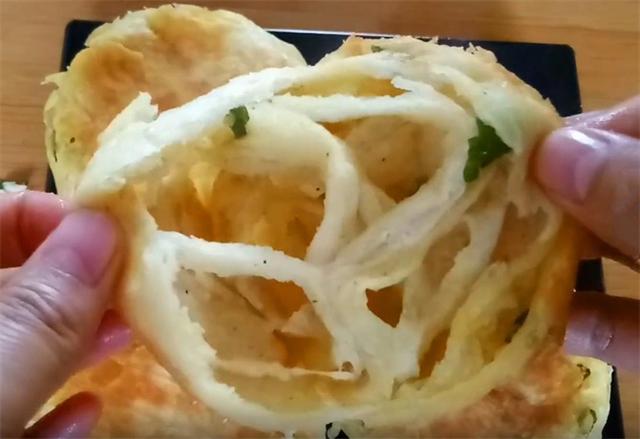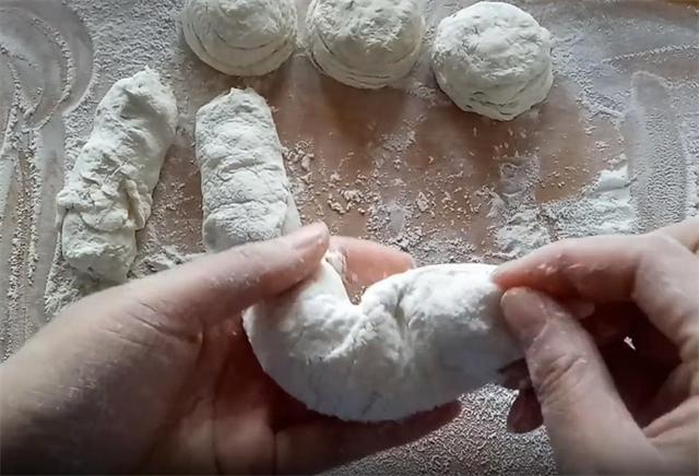 6.接下来我们把面剂的两端像这样用手把它捏合,防止葱花和油酥露出,然后两手向相反的方向旋转,这样做的目的是增加饼的层次,轻轻的把旋转好的饼皮按扁即可,不要用力,因为旋转的过程中饼皮已经上劲,如果用力的话饼皮会破损。