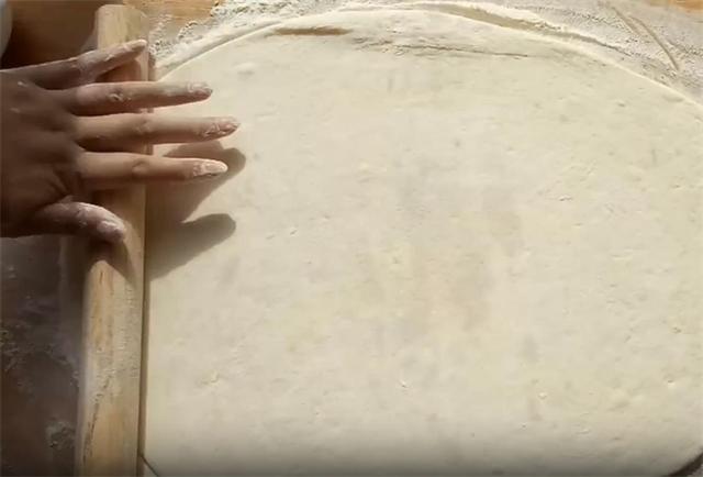 3.我们在案板上多放一些干面粉,把发好的面糊倒在面粉上,防止与案板粘连,我们利用干面粉把面糊整理成圆形,用手先把它按薄,然后撒上一层干面粉,再用擀面杖把它擀薄擀均匀,大约擀至半厘米的厚度即可。